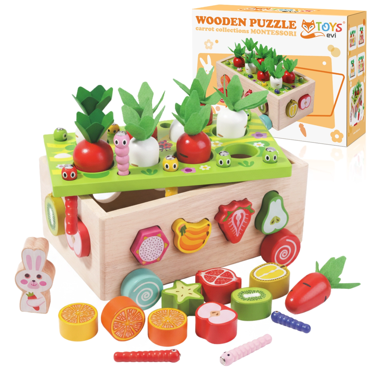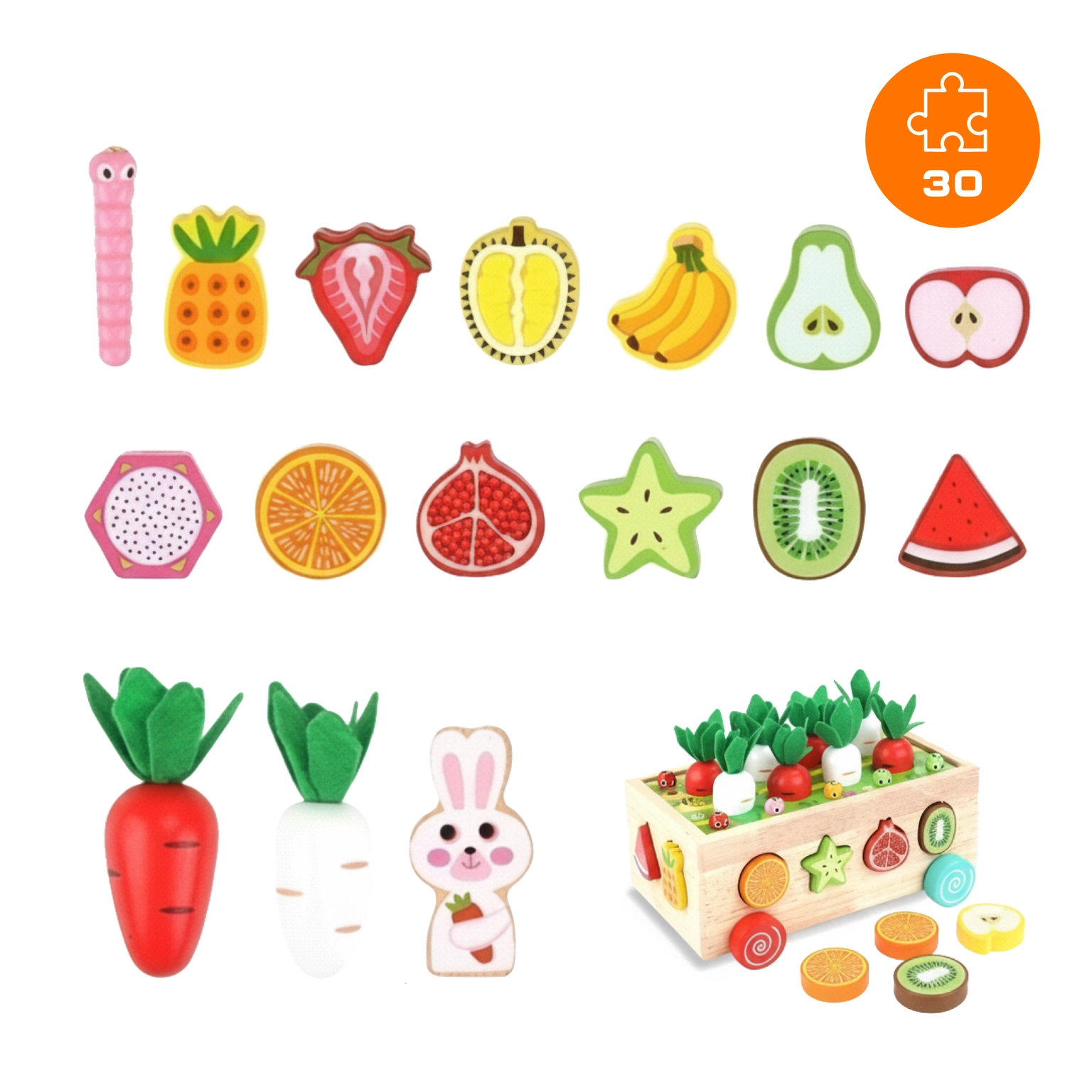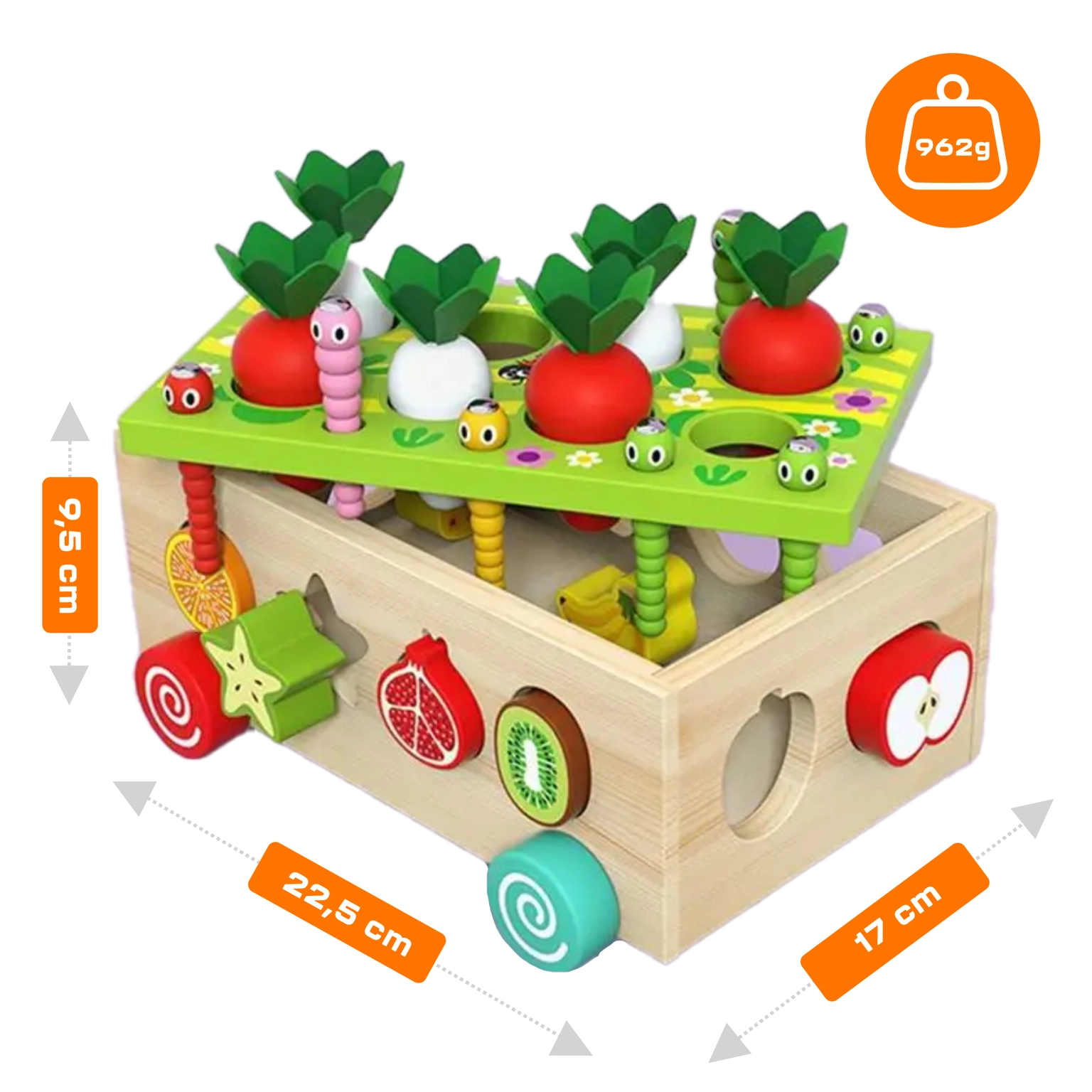 ✔️ Sada: 12 ovocných kostek, 8 mrkviček, 10 červíků, vozík na kolečkách