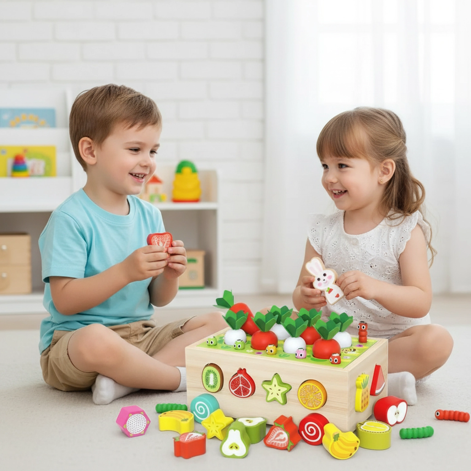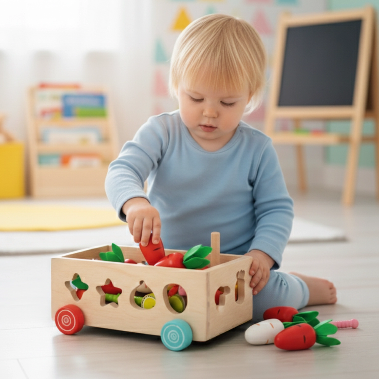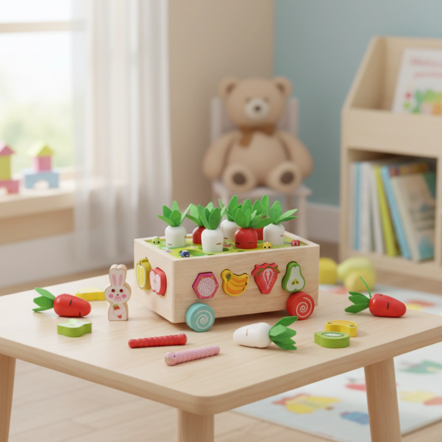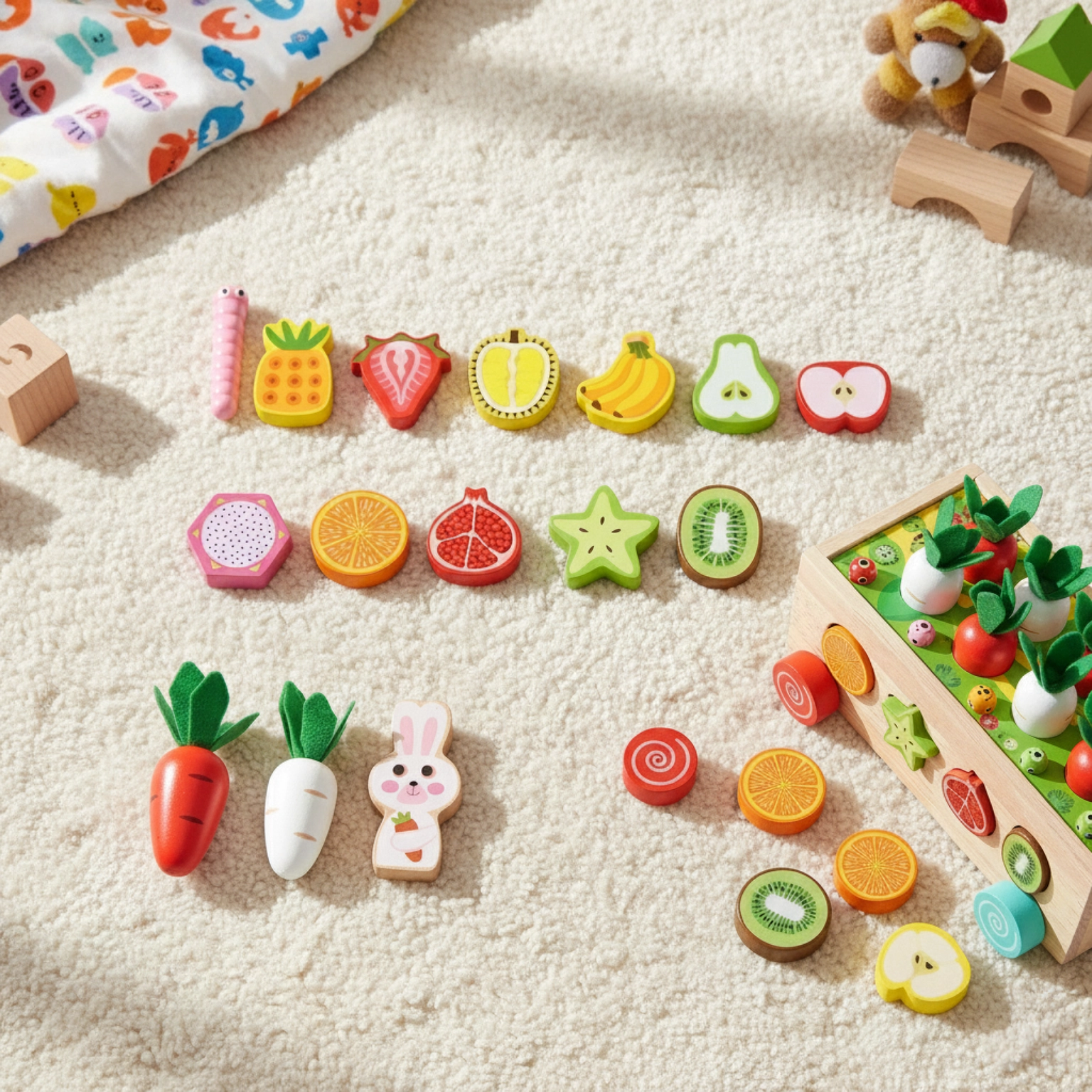 ✔️ Sada: 12 ovocných kostek, 8 mrkviček, 10 červíků, vozík na kolečkách