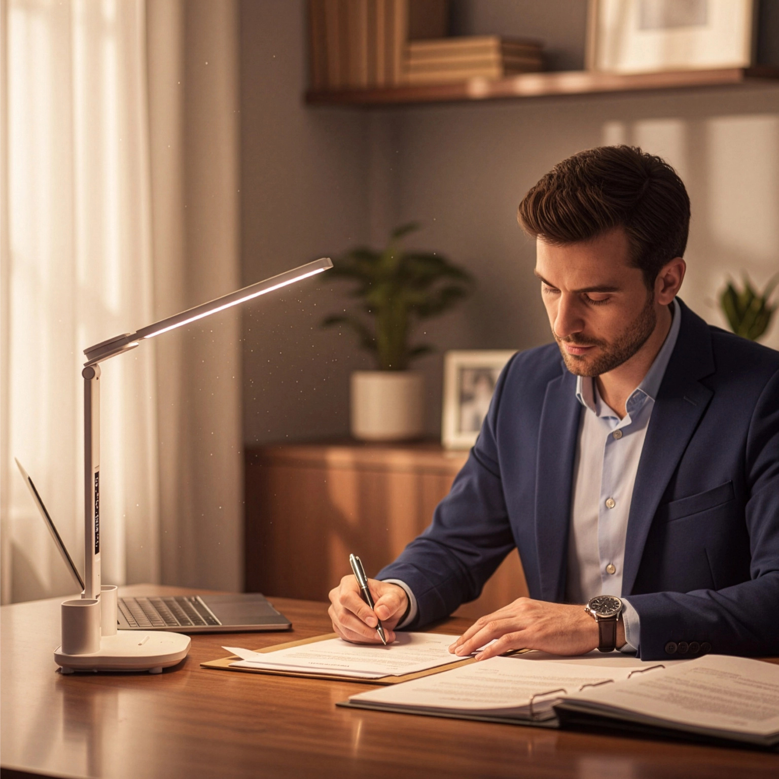 ☑️ Kancelářská a práce z domova – ergonomické osvětlení a pořádek na stole.