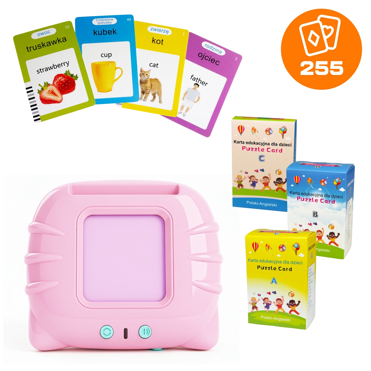Your little one can start their foreign language adventure naturally and enjoyably! The EduReader educational card reader is a modern toy that combines vocabulary learning with entertainment. With 255 colorful cards, children learn up to 1020 words in Polish and English, and simple operation and interactive features make learning a pleasure. The product supports concentration, memory, and pronunciation, helping children develop linguistically from an early age.