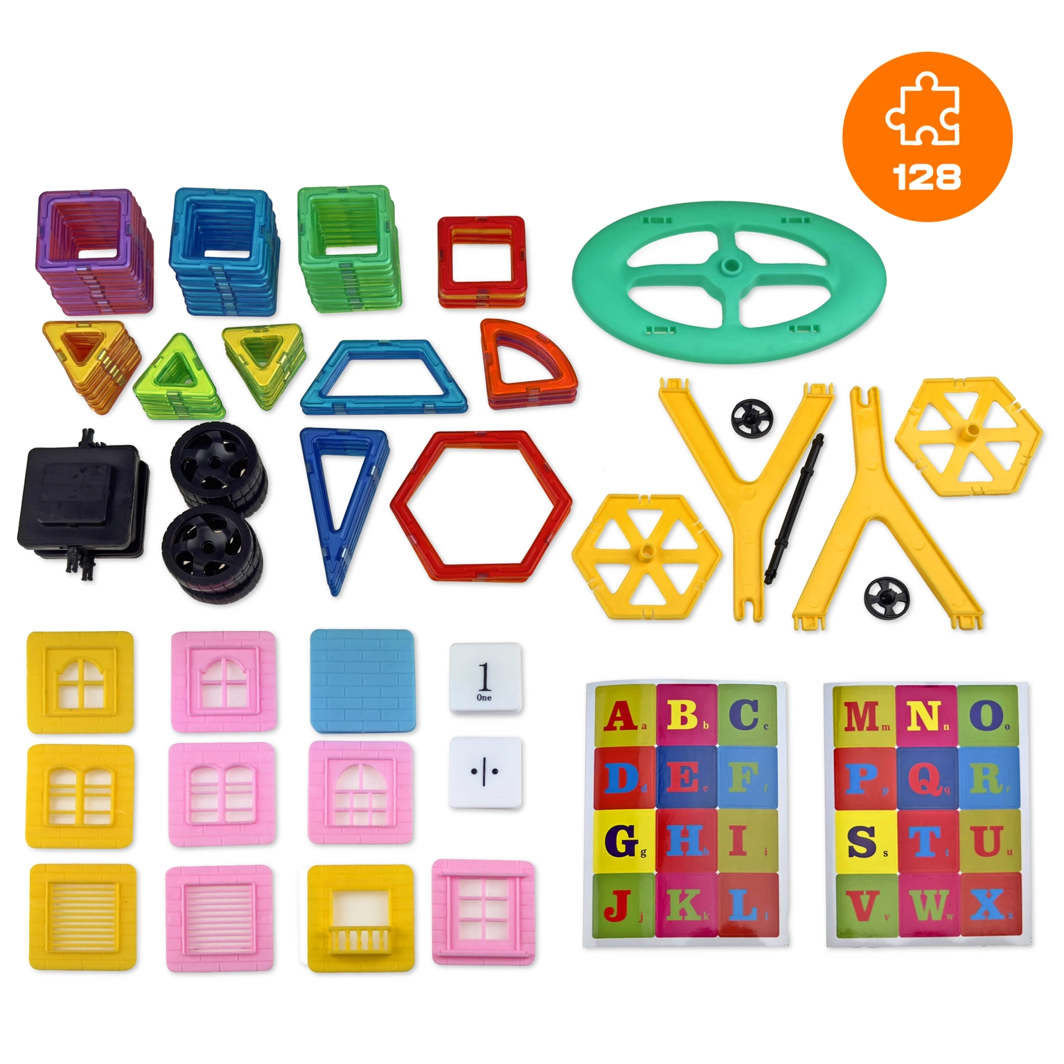 The set includes 128 pieces, including magnetic parts and additional accessories.