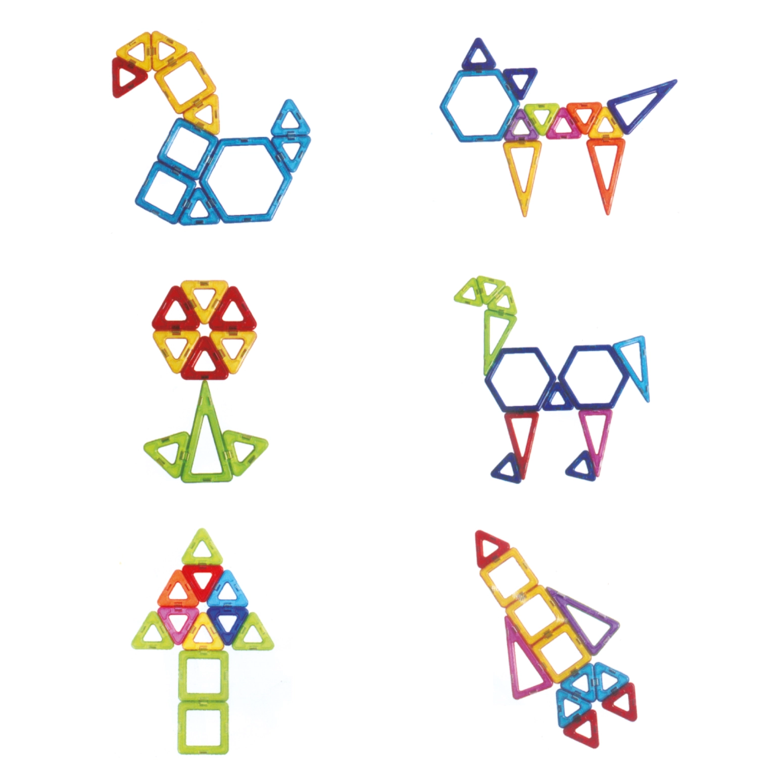 ✔️ Magnetic elements: 34x square, 19x equilateral triangle, 4x scalene triangle, 4x quarter circle, 2x hexagon, 2x trapezoid