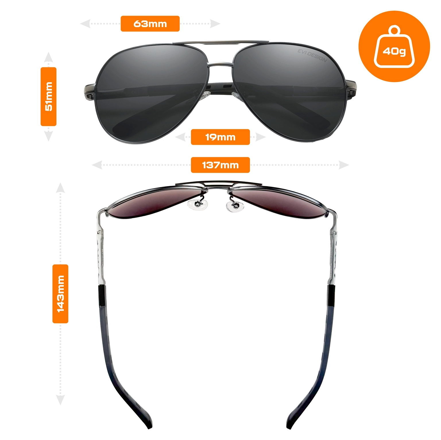 Stylish EVI DESIGN AVIATOR sunglasses inspired by the timeless aviator shape, designed for eye protection and wearing comfort. Equipped with a UV400 filter, they effectively block 100% of harmful UVA, UVB, and UVC radiation, while polarized lenses eliminate glare, ensuring clear and sharp vision. A lightweight, durable frame made of metal and polycarbonate, along with adjustable nose pads, guarantee a perfect fit. They are an excellent choice for those who value classic elegance and safety, both in everyday city activities and during long journeys.