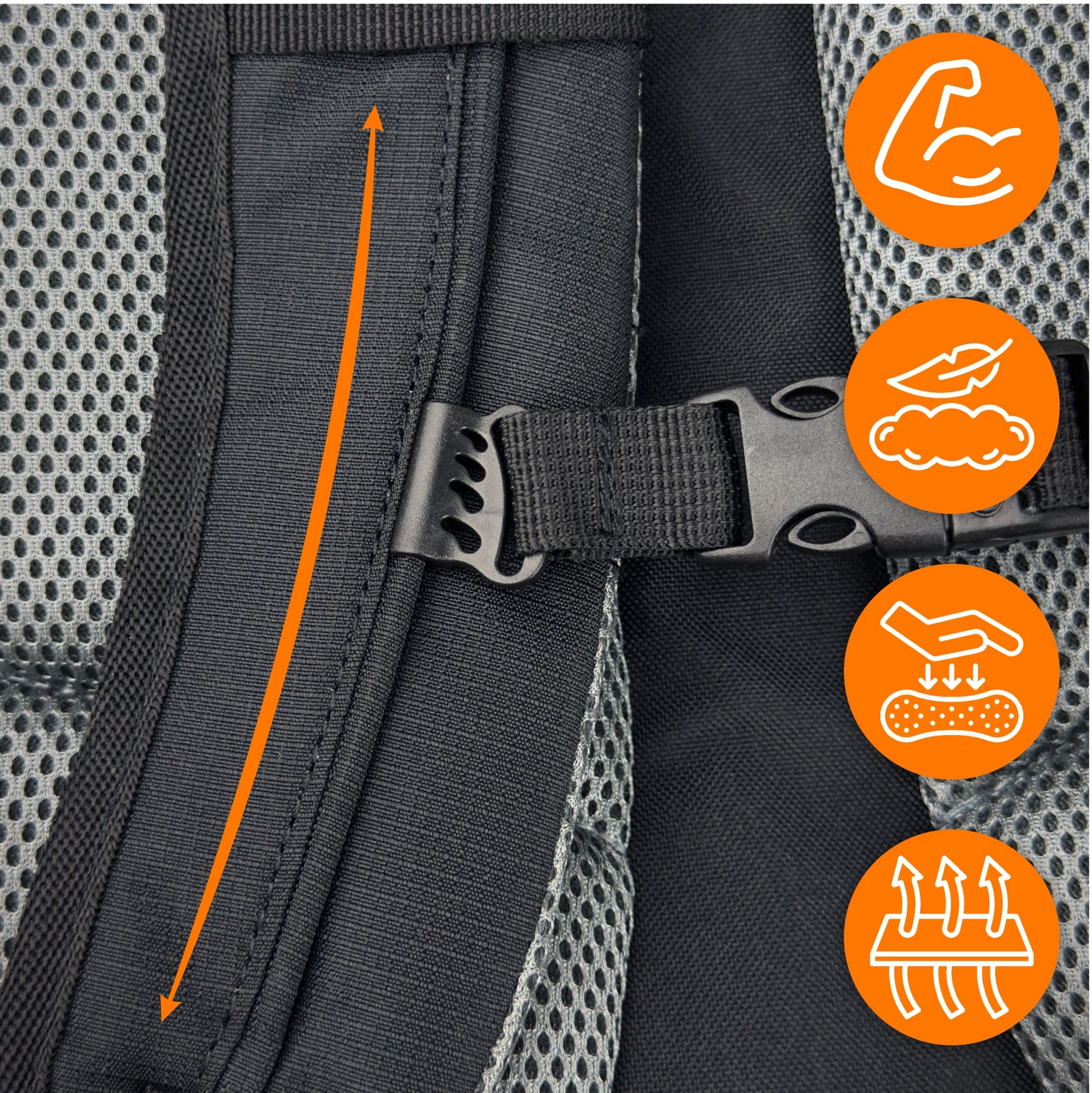 ✔️ System nośny: wentylacja pleców, regulowany pas piersiowy i biodrowy