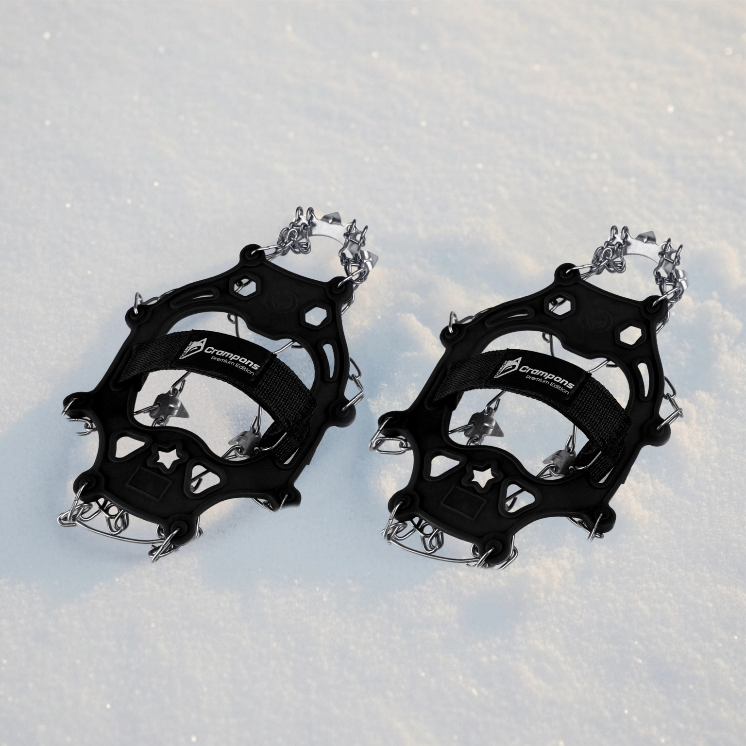 Sercem raczków Crampons Premium jest bezkompromisowy system przyczepności. Aż 9 potężnych, hartowanych zębów ze stali nierdzewnej agresywnie wgryza się w lód, zbity śnieg i śliskie podłoże, gwarantując maksymalną trakcję. W połączeniu z solidnym systemem łańcuchów, również wykonanych ze stali nierdzewnej, konstrukcja zapewnia stabilność w każdych warunkach. Zapomnij o poślizgnięciach – ten system został zaprojektowany, by dać Ci pełną kontrolę i bezpieczeństwo na każdym kroku.